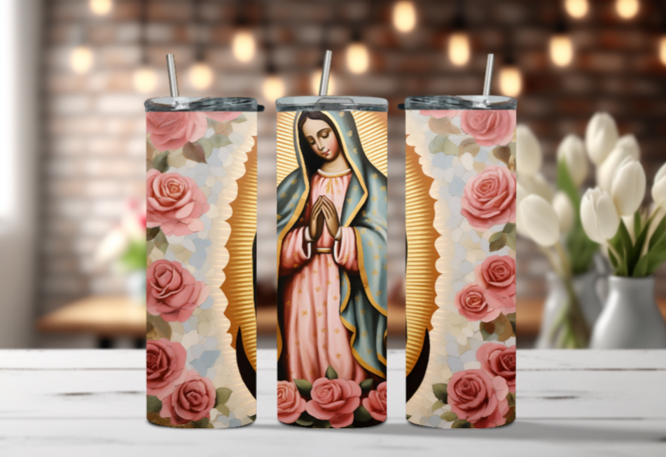 This beautiful design of the Virgen de Guadalupe is in soft shades of blush pinks, creams, and soft greens.